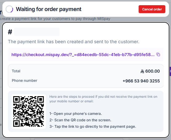 After filling in all the required information, click the "Create & Send Link" button. The customer will instantly receive the payment link. If, for any reason, the link is not received, you can resend it manually, or the customer can scan the QR code displayed on the merchant's screen: