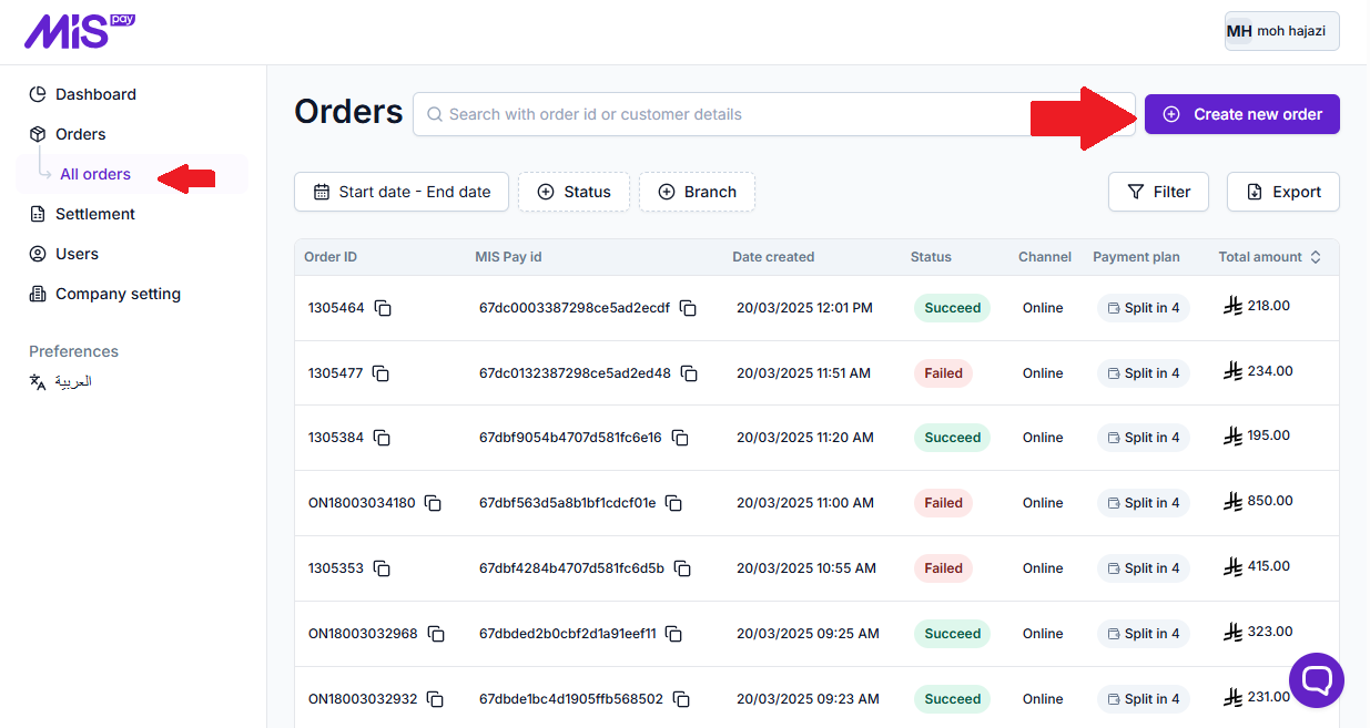 From the side menu, under “Orders” section, Click “All orders” tab.
