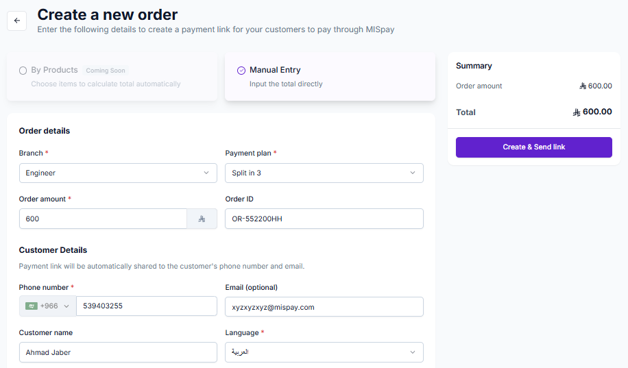 - Phone number (Mandatgory): The customer’s phone number where the payment link will be sent.