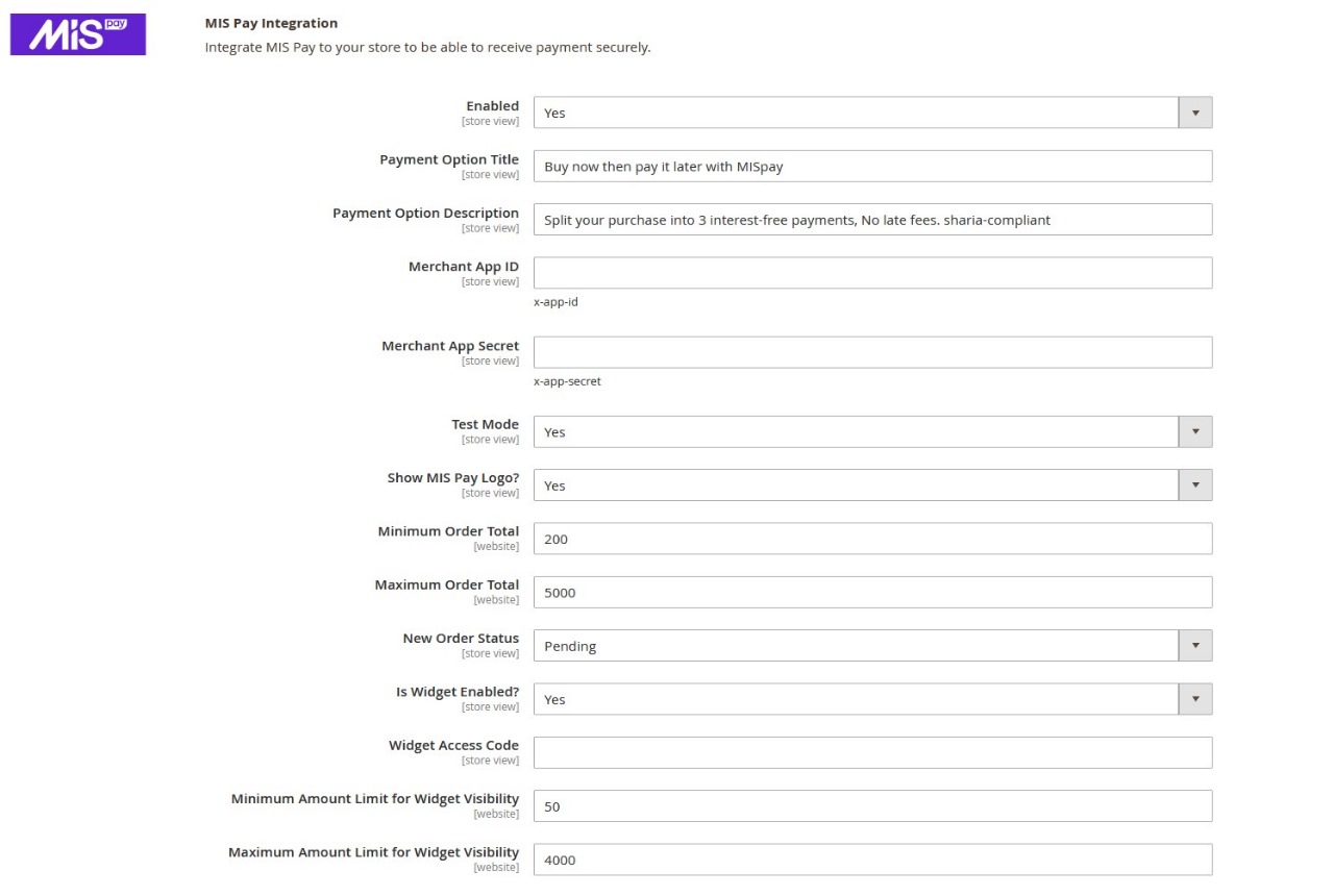 Yes - API Keys: Enter sandbox credentials provided by MISPay (App ID, App Secret, and Widget Access Code)