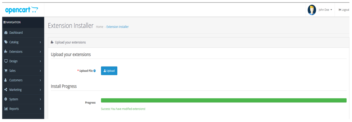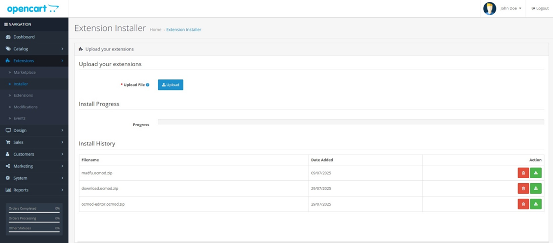 Log in to your OpenCart website as an administrator. Then, navigate to Extensions → Installer. You should see a page similar to the one shown below: