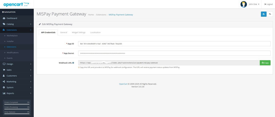 You need to insert “App ID” and “App Secret” which you have received from MISpay team.