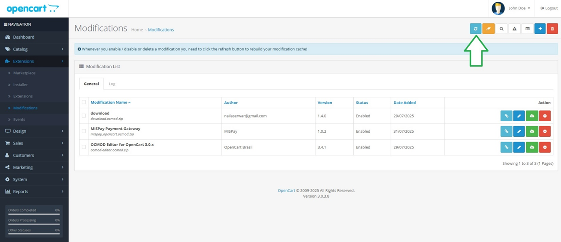 Navigate to Extensions → Modifications, then click the Refresh button located at the top of the page