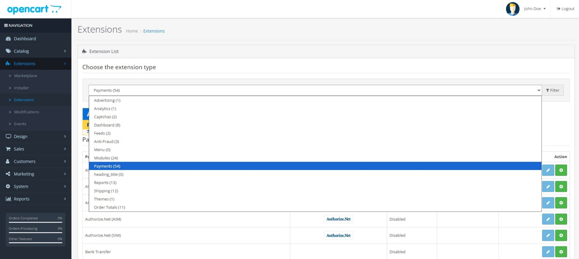 Navigate to Extensions → Extensions, then select Payments from extension type dropdown list as below: