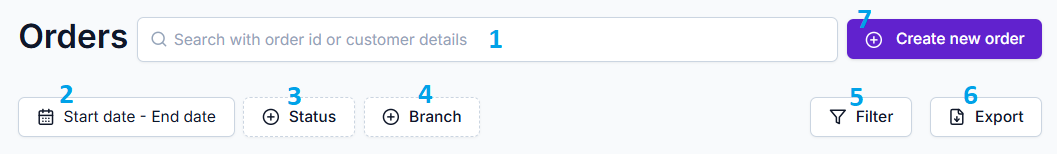 Search Bar: Allows you to search using the Order ID, customer details, or any part of them.